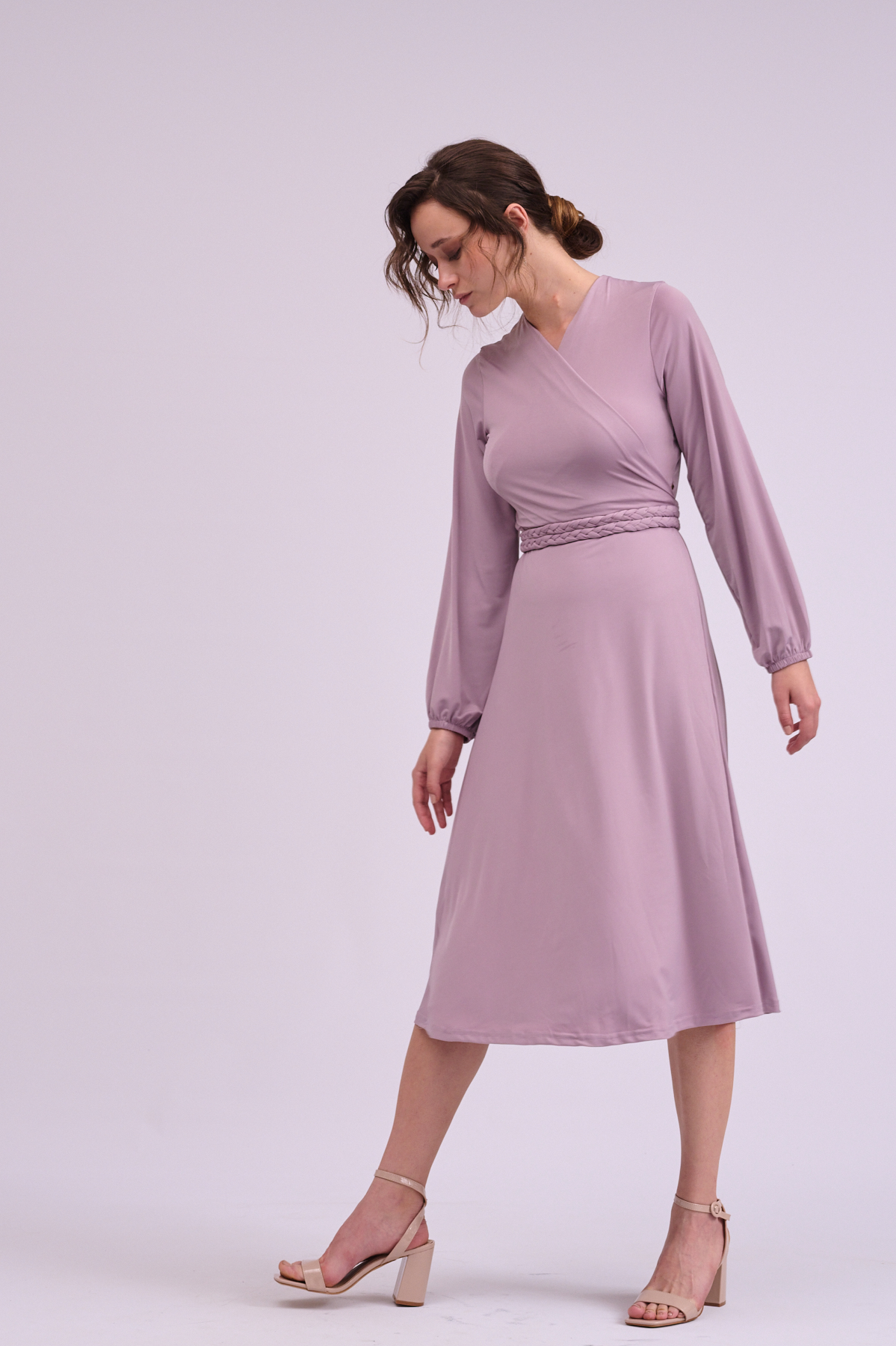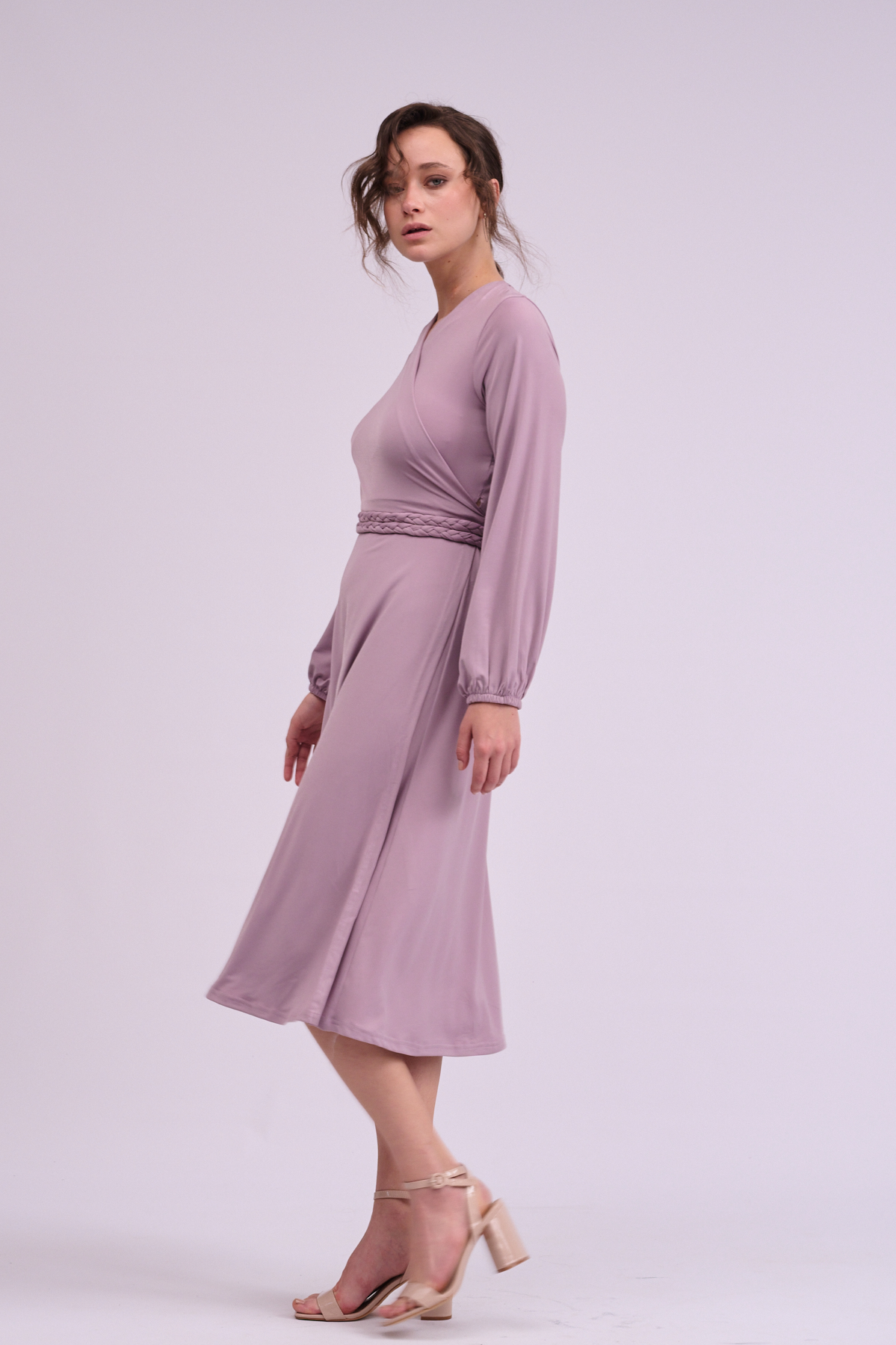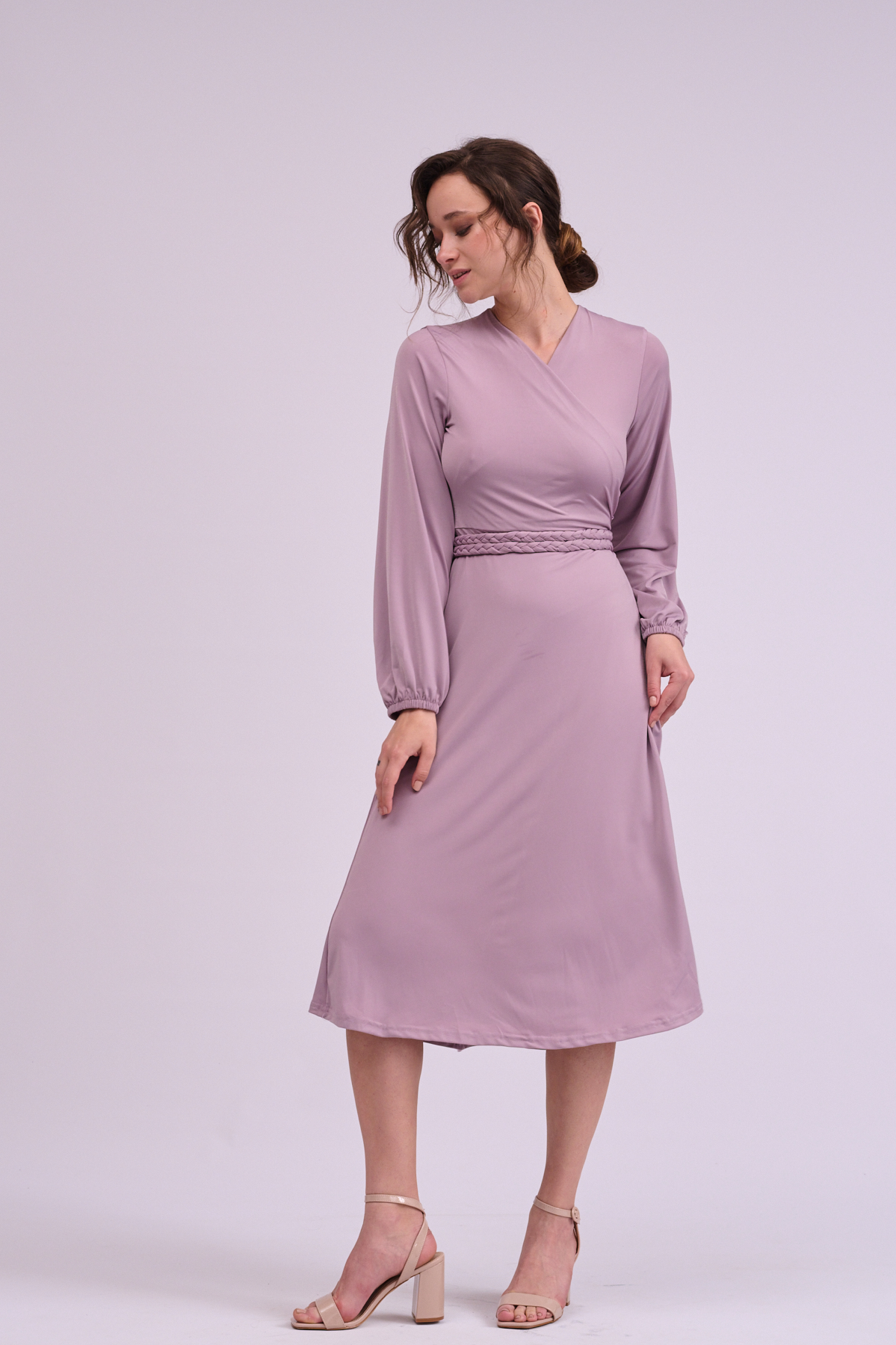 שמלה קלאסית ושימושית מבד לייקרה איכותי עבה בגזרת מעטפת הנסגרת היטב ללא צורך בכפתור
